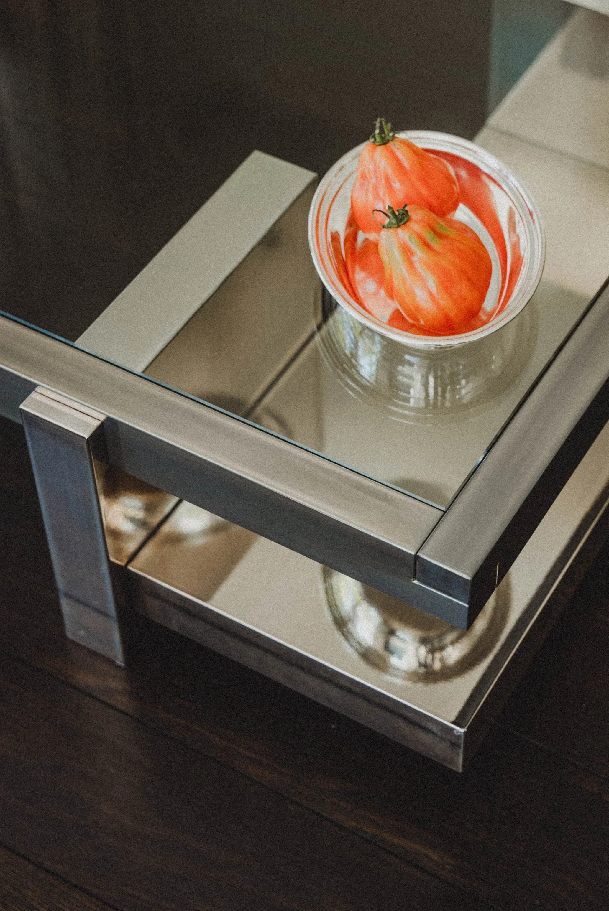 construction is consistently composed of two materials; glass paired with varnished iroko wood - chestnut wood - metal finish, chrome - high-gloss lacquer, available in five color options
